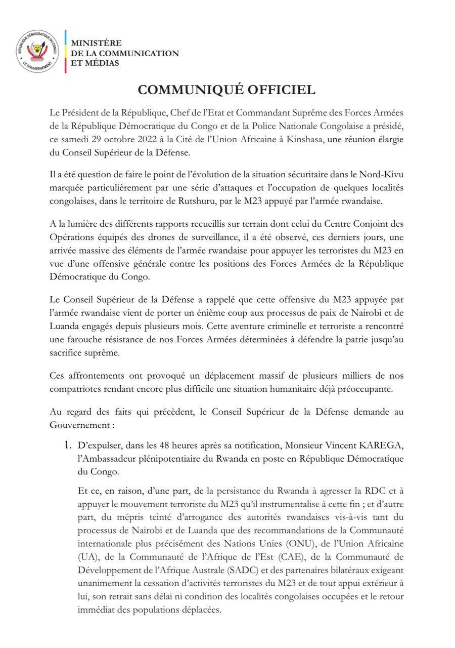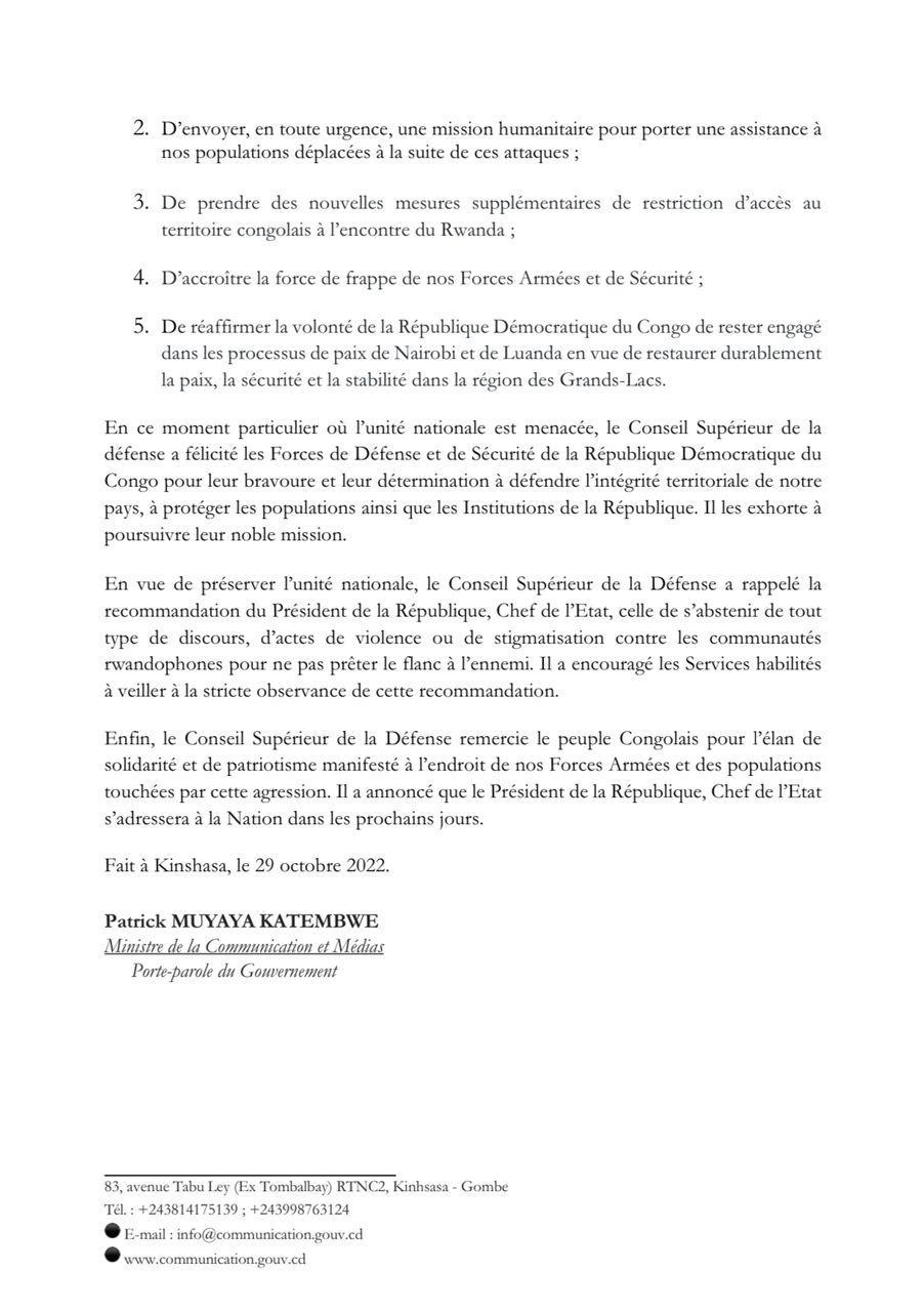Voici le communiqué du Conseil supérieur de la défense de la RDC :