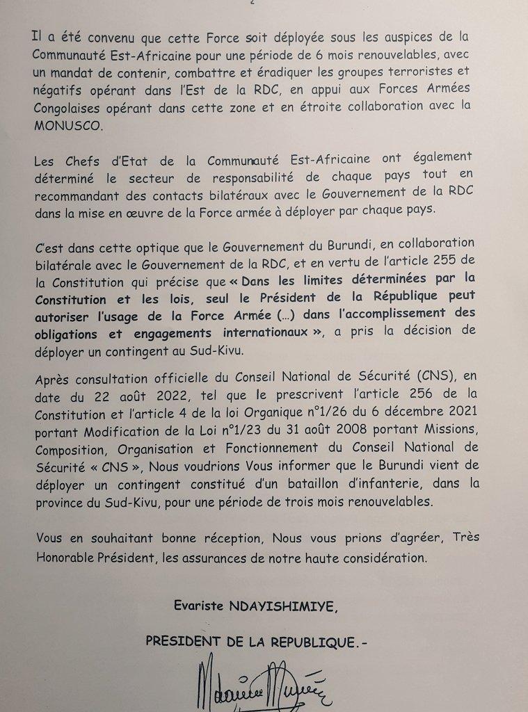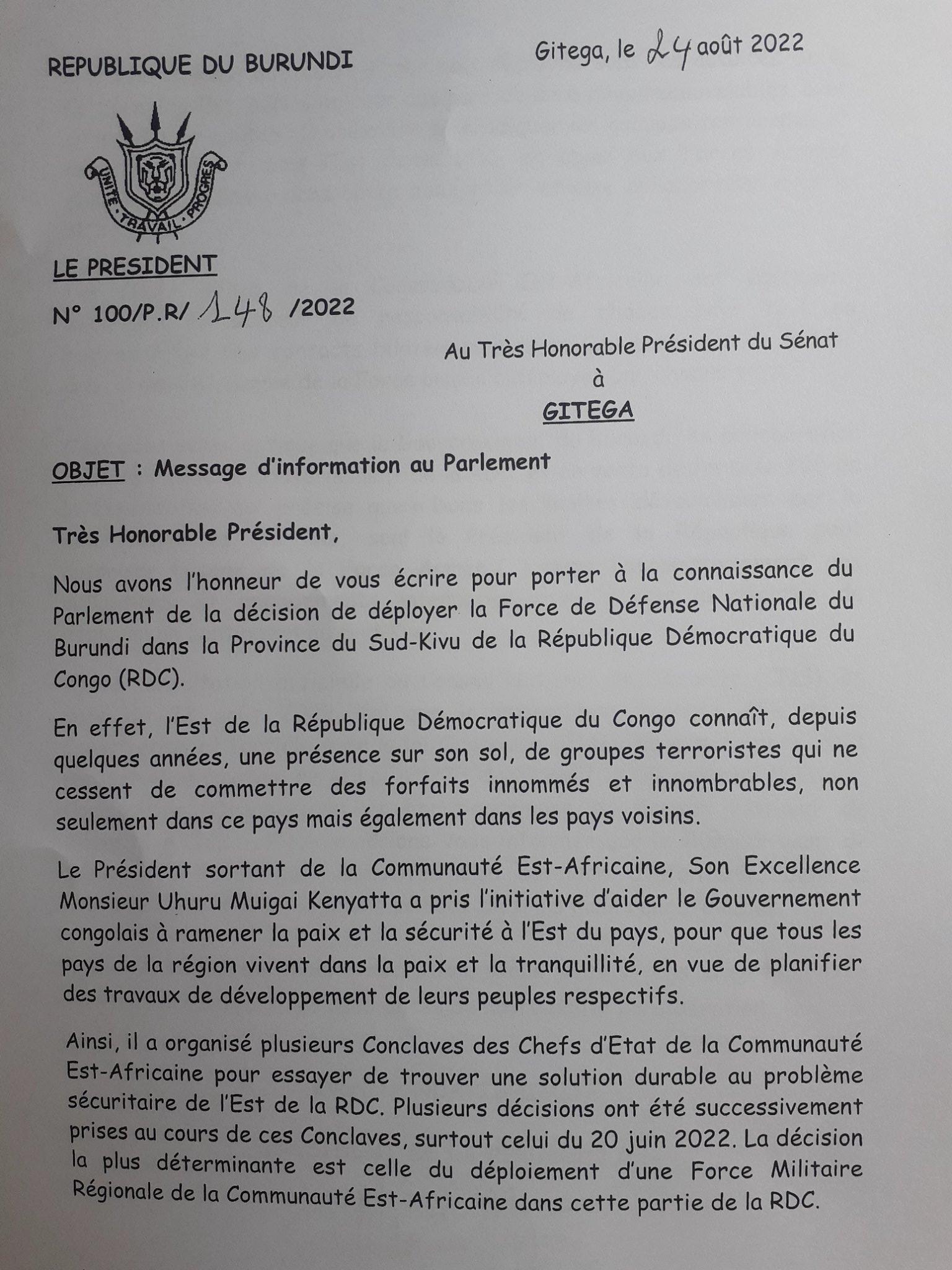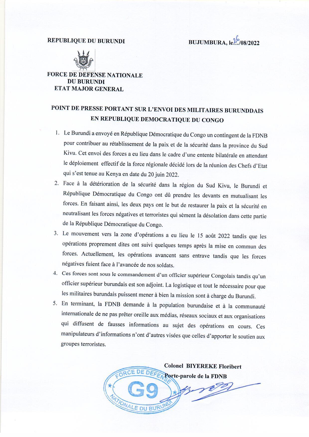 Après que la RDC Congo ait déjà informé l’opinion nationale et internationale depuis quelques jours, faisant suite à un message d’information de la Présidence burundaise au Parlement burundais datant du 24/08/2022, ce vendredi, Colonel Biyereke Floribert, porte parole du la Force de Défense Nationale du Burundi ( FDNB ), en point de presse, a informé, pour la première fois, le public burundais de l’envoi de militaires Barundi en RDC Congo pour une mutualisation des forces de défense des 2 pays, avec un commandement composé d’un officier supérieur Congolais des Forces Armées de la RDC ( FARDC ) et d’un officier supérieur Burundais de la FDNB comme adjoint, afin de contribuer au rétablissement de la paix en province du SUD-KIVU. S’agissant d‘un bataillon d’infanterie burundais, pour une période de 3 mois renouvelables.