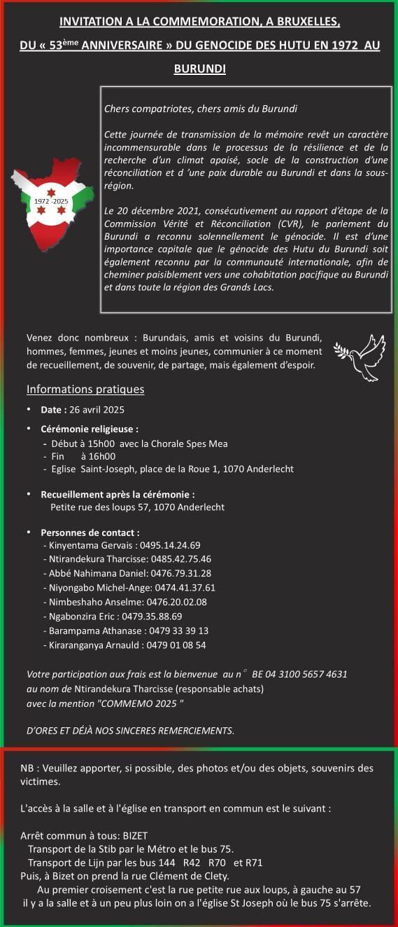 Le 26 avril prochain, des membres de la Diaspora Burundaise de Belgique [3] se réuniront à Bruxelles pour commémorer le 53ème anniversaire du Génocide contre les Hutu du Burundi de 1972. Cette cérémonie, qui se tiendra à l’église Saint-Joseph d’Anderlecht, s’inscrit dans une démarche de mémoire, de réconciliation et d’espoir.