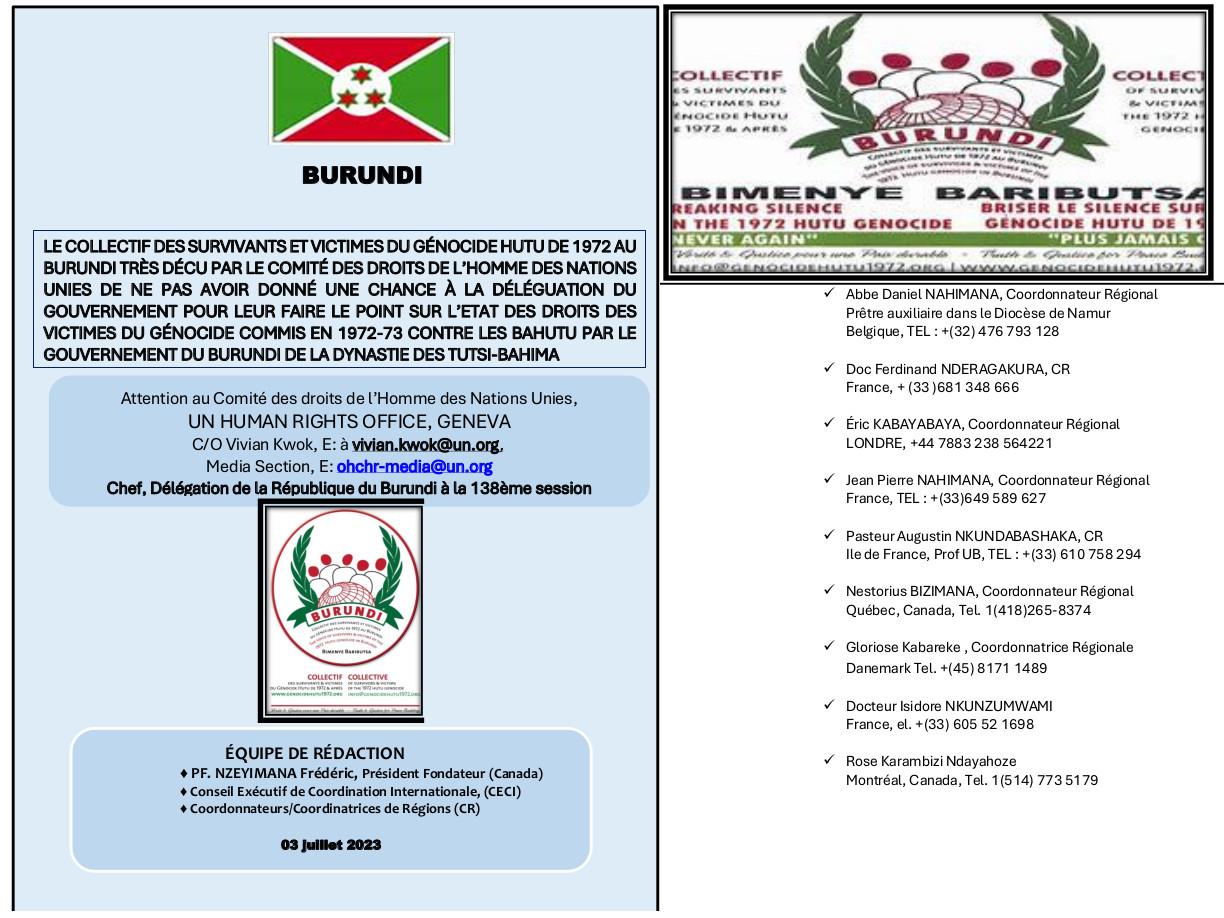 Le Collectif des survivants et victimes du génocide de 1972 contre les Hutus au Burundi exprime sa profonde tristesse face à la déclaration discriminatoire récente de certaines organisations burundaises négationnistes. Cette déclaration, survenue après les rencontres de la Commission Vérité et Réconciliation à Bruxelles , nie le génocide de 1972-73 commis par le gouvernement Micombero sous la dictature militaire burundaise.