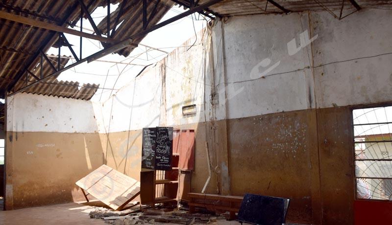 A quelques mètres de la direction, des gens collectent les tôles et les charpentes emportées par le vent. Un charpentier met les tôles sur une partie du dortoir féminin alors qu’un travailleur nettoie les restes du toit détruit par le vent dans le réfectoire.