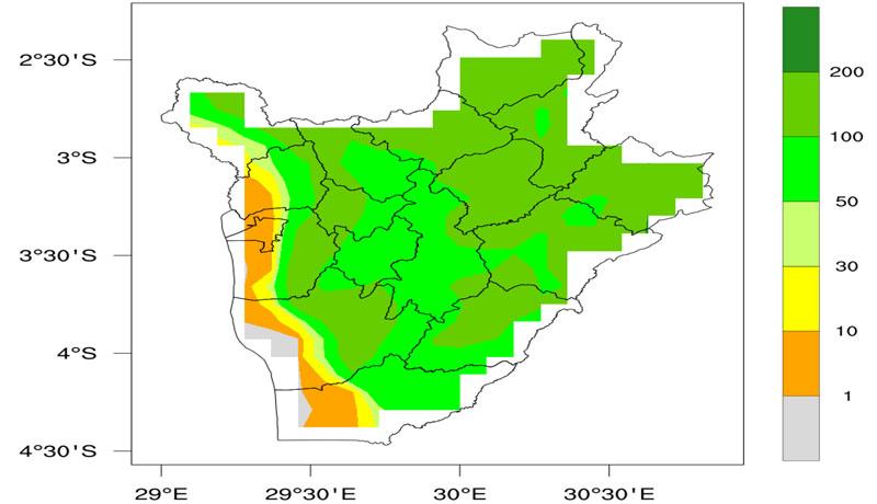 D’après cette même source, dans une partie de Kirimiro, Moso, Buragane et Mirwa, les prévisions pluviométriques font état d’une pluviométrie modérée située entre 50 et 100 mm. Pour une autre partie de Mirwa et Imbo Sud, l’IGEBU signale qu’on s’attend à une pluviométrie normale située entre 10 et 30 mm.