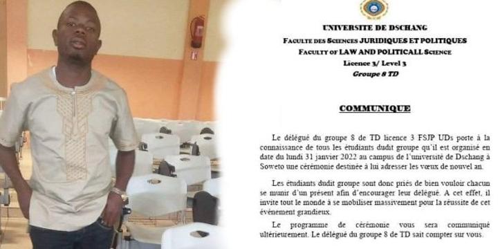 Le fameux étudiant, Zeufack Davy, s’est fendu d’un communiqué avec les enseignes de l’Université invitant les étudiants de son groupe de TD les invitant à une cérémonie de présentation de vœux qu’il projetait sur la date du 31 janvier. A cet effet, « les étudiants dudit groupe sont donc priés de bien vouloir chacun se munir d’un présent afin d’encourager leur délégué. A cet effet, il invite tout le monde a se mobiliser massivement pour la réussite de cet évènement grandieux « , peut-on lire dans son communiqué.