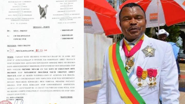 Africa-Press – Cameroun. Le bras de fer foncier qui oppose le député MANFOUO David à la succession TEHAM dans l’arrondissement de Dibombari, département du Moungo, région du Littoral, vient de franchir un nouveau palier. Dans un message-porté daté du 17 février 2026, le Sous-Préfet de Dibombari, Jean-Philippe NGO’O MEBE, administrateur civil, a ordonné l’arrêt immédiat des travaux sur le domaine privé sis à Bekoko, et prévenu que tout contrevenant serait déféré devant le Procureur de la République près le Tribunal de Première Instance de Mbanga pour rébellion, conformément à l’article 157 de la loi n°2016/007 du 12 juillet 2016 portant Code Pénal.