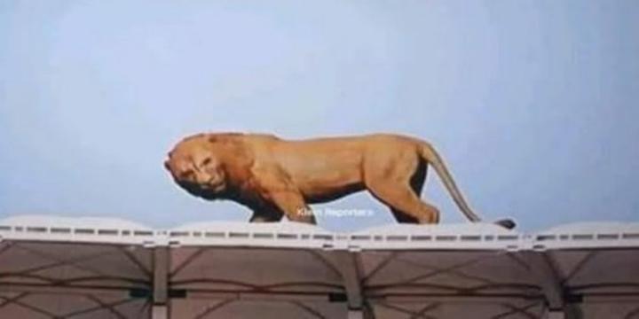 « Un lion impressionnant sur le toit du stade d’olembe.