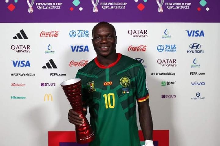 Grâce à son lobe et sa passe décisive sur le troisième but camerounais de la rencontre Cameroun-Serbie, l’attaquant a remporté ce trophée et Davis Epassy le remplaçant de André Onana, les deux seuls reçus par les Lions indomptables dans cette 22e Coupe du monde.