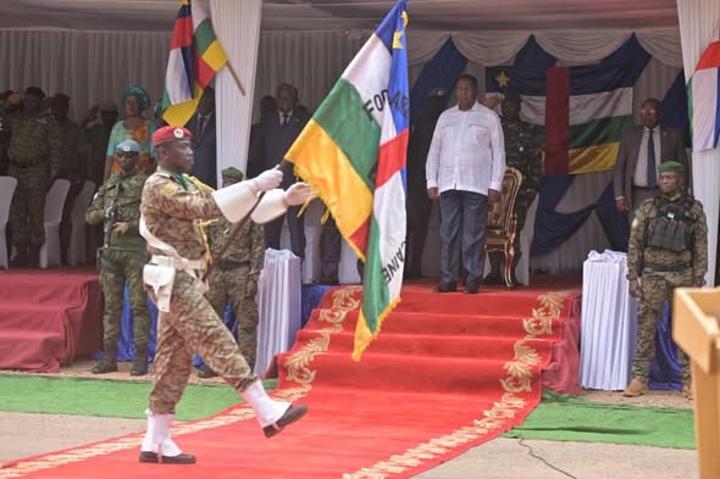 Africa-Press – CentrAfricaine. Le Président de la République, Chef de l’État et Chef Suprême des Armées, Son Excellence Professeur Faustin Archange Touadéra, a présidé une cérémonie militaire couplée au Camp Kassai. L’événement a marqué le passage sous le drapeau de nouvelles recrues ainsi que la remise de diplômes de perfectionnement à des officiers et sous-officiers des Forces Armées Centrafricaines (FACA), formés avec l’appui de la force de défense du Rwanda.