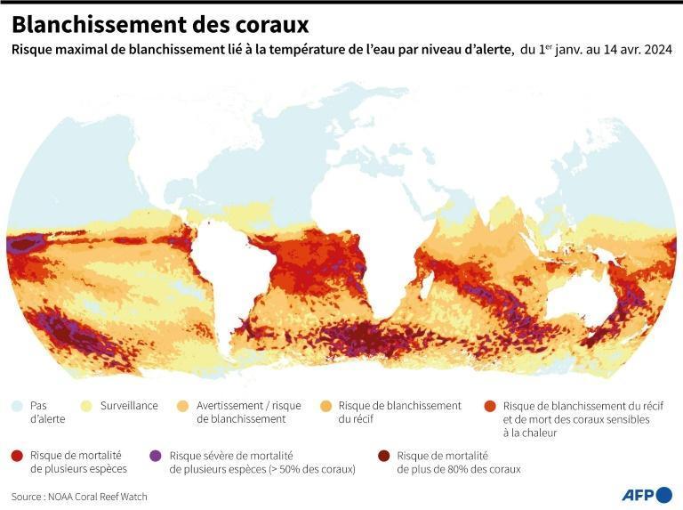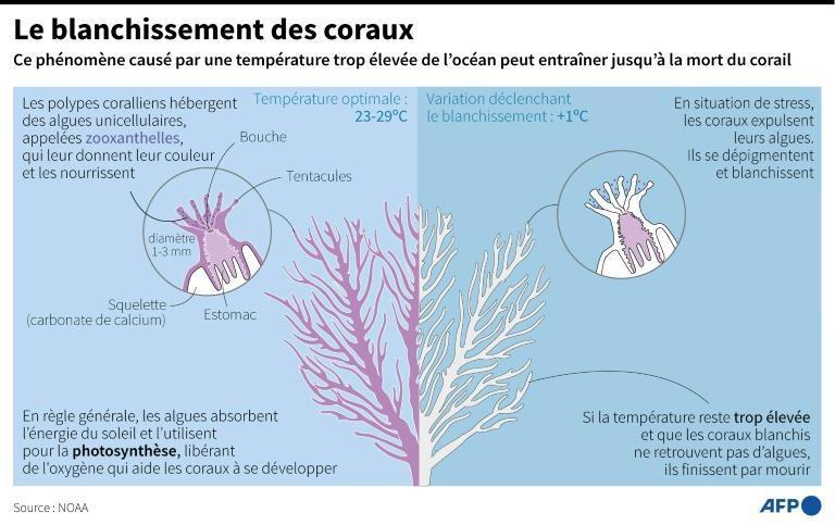 Pas moins de 60,5% de la surface des récifs coralliens du monde ont été touchés par un stress thermique durant les 12 derniers mois, un record sur un an, selon NOAA.