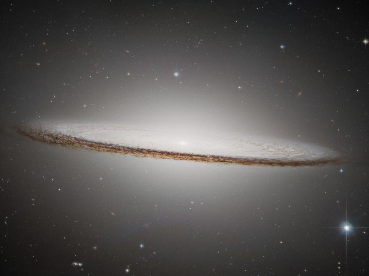 Visible avec un petit télescope de 200 mm et même (plus difficilement) avec une lunette, la galaxie du Sombrero est une cible appréciée des passionnés d’astronomie. Officiellement nommée Messier 104 (M104), elle doit son surnom à son apparence: un bulbe central massif surmonté d’un disque plat de poussières sombres, évoquant le chapeau mexicain. Vue presque par la tranche depuis la Terre, elle est l’un des rares objets célestes à mêler ainsi les caractéristiques de deux grandes familles de galaxies: elle a l’aspect d’une galaxie spiralée mais son noyau présente une densité stellaire typique des galaxies elliptiques.
