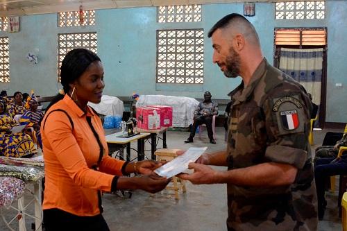 À l’issue des traditionnels discours, un don composé de machines à coudre et de tissus a été remis à l’association afin qu’elle puisse augmenter le nombre de personnes formées. Grace à ce don, la France s’inscrit dans la durée dans l’accompagnement des initiatives locales en République Centrafricaine. Le DLC de la MISLOG avait effectué, en août 2021, un don de machines à coudre à cette association ce qui a permis à ces femmes du quartier d’entamer le processus de génération de revenus.