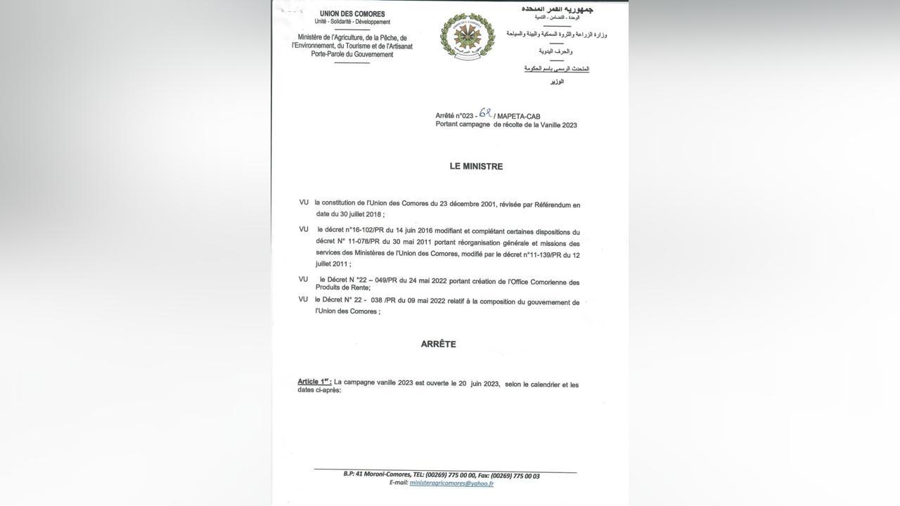 L’arrêté interdit toute commercialisation de la vanille verte avant l’ouverture de la campagne. « Le contrevenant sera poursuivi et réprimé conformément aux dispositions des textes législatifs et règlementaires en vigueur. Il sera contraint de payer une amande dont les modalités et le montant seront fixés par l’office comorien des produits de rente », note l’arrêté, précisant que toute vanille immature serait retiré du marché et détruite.