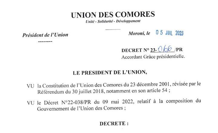 A la veille de la fête Nationale, le président de la République Azali Assoumani a usé de l’une de ses prérogatives constitutionnelles à savoir le pouvoir de grâce. « Le président de l’Union a le droit de faire grâce » comme le stipule l’article 54 alinéa 13 de la constitution de 2018. Ainsi par le décret 23-066/PR, le président a accordé la grâce à seize détenus qui étaient sur l’ensemble du territoire. « Les personnes dont les noms suivent, condamnées par la Cour de Sureté de l’Etat, lors des audiences du mois de mars 2022, sont graciées de la totalité de leur peine respective » peut-on lire dans l’article premier dudit décret. Une libération qui concerne 8 détenus qui étaient emprisonnées à la prison de Koki.