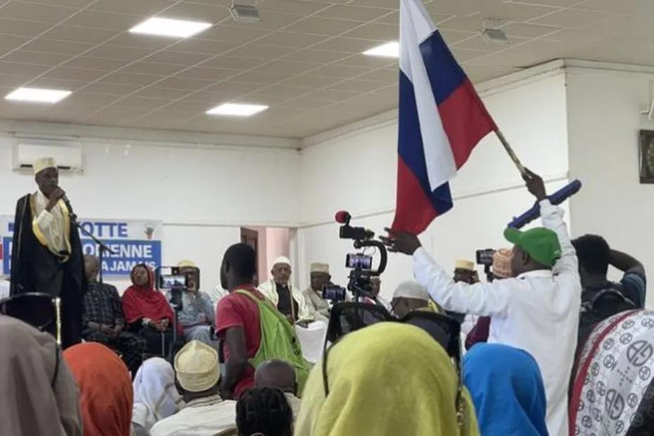 Inspiré par les scènes vues dans les manifestations anti-françaises en Centrafrique, au Mali et au Burkina Faso, un jeune homme a fait irruption dans un rassemblement de notables, hommes politiques de tous bords et associations comoriennes. Il était vêtu d’un boubou aux couleurs de la Russie, et brandissait un drapeau russe.