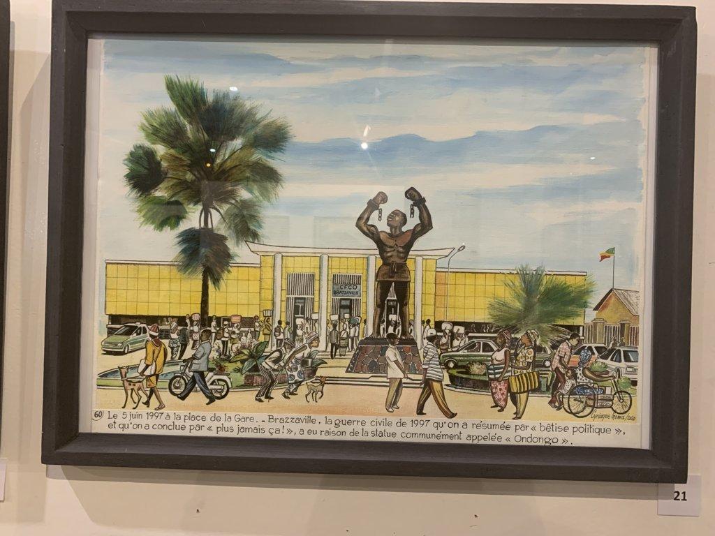 « La présente exposition se propose ainsi de suivre la longue marche de cette cité affectueusement appelée par ses habitants : Brazza la verte. Elle présente une cartographie condensée de l’espace et du mode de vie de ses habitants sur plus d’un siècle. Elle part ainsi des modestes agglomérations précoloniales du Mpumbu à leurs foires célèbres, à partir de l’installation coloniale jusqu’à en faire une cité urbaine, attirant par son rayonnement des populations de toutes provenances culturelles, pour finalement devenir le berceau de la rumba et de la sape comme sa sœur jumelle Kinshasa », a expliqué le dessinateur congolais.