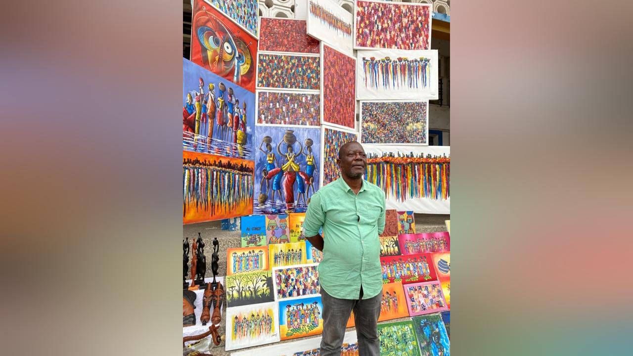 Pendant son enfance à Pointe-Noire, Germain et ses quatre frères observaient avec attention le travail de leur père, le grand peintre Jean Roger Guymack. “Notre père travaillait d’abord à l’école de Poto Poto puis il s’est installé devant ce bâtiment avant 1968”, explique Germain Guymack assis sur les marches de la poste devant ses sculptures et ses peintures. C’est à la mort de leur père que les quatre frères ont décidé de rallumer le flambeau en devenant eux aussi artistes peintres.