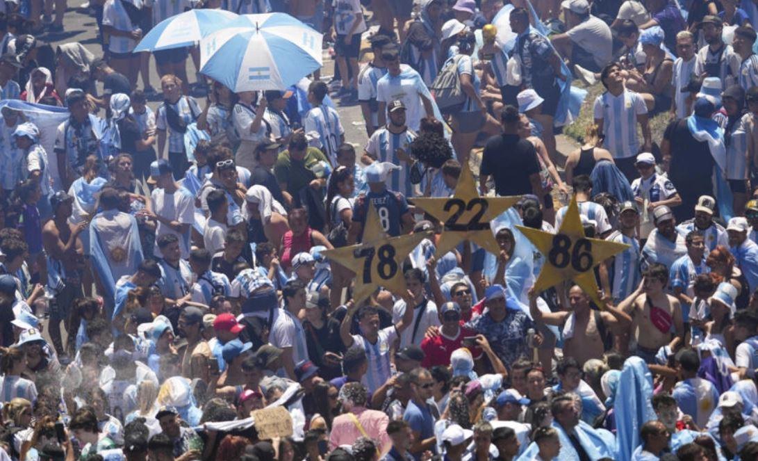 En ce mardi 20 décembre, l’ambiance est brûlante et pas seulement parce que c’est l’été en Argentine et que le mercure épouse les 30 °C. Pour le retour de leurs héros, champions du monde, les supporters de l’Albiceleste ont investi les moindres recoins de Buenos Aires. L’avenue du 9 juillet, longue de 3 km, et son fameux obélisque, où les coéquipiers de Leo Messi sont attendus, est parée de ciel et blanc.