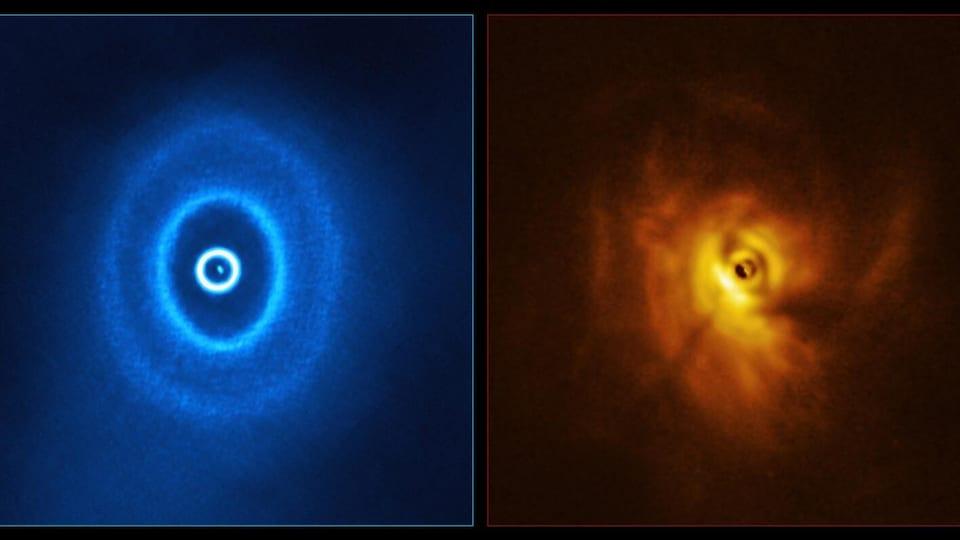 Le système stellaire triple GW Orionis. L’image de gauche montre la structure annulaire du disque, l’anneau le plus interne étant séparé du reste du disque. L’image de droite montre l’ombre de l’anneau le plus interne sur le reste du disque.