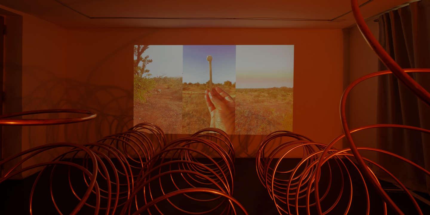 Des oiseaux chantent, une flûte s’immisce dans le gazouillement général et rejoint les bruissements des branches sous ses pas. Plusieurs objets du même alliage – un triangle, un L, un demi-cercle, une ligne droite… – se succèdent dans sa paume, qualifiés par l’artiste de « lignes d’errances ». Devant l’écran, d’imposantes spirales de cuivre imitent le mouvement de la marche, fluide et continu.