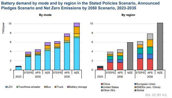 En 2023, la demande mondiale de batteries a déjà enregistré une progression de plus de 40 % par rapport à 2022, atteignant 850 GWh. Cette hausse est principalement portée par les ventes de véhicules électriques, qui représentent près de 90 % de la demande totale. Selon le rapport de l’AIE intitulé « EV Battery Supply Chain Sustainability », cette dynamique devrait se poursuivre, avec une multiplication par 4 de la demande d’ici 2030 et par 7 d’ici 2035, dans un scénario où les politiques actuelles seraient maintenues.