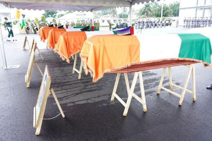 « S’il est vrai que la mort fait partie du cycle de l’existence de l’Homme, s’il est admis que celle du soldat est un sacerdoce, les circonstances de leur décès nous affligent et nous plongent dans une souffrance indicible. Oui, cette fin prématurée, ce fauchage brutal de la mort dans la fleur de l’âge, ce terme soudain à une carrière prometteuse, l’espoir fané d’une vie pleine nous laisse ahuris et médusés », a-t-il affirmé, avant de rassurer sur l’engagement des soldats encore sous le drapeau à poursuivre la bataille contre les groupes terroristes pour être dignes du sacrifice des disparus.