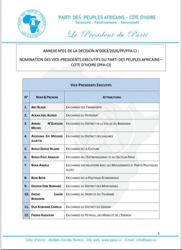 Le nouveau Secrétariat Géneral du PPA-CI est composé de trente-trois (33) membres.
