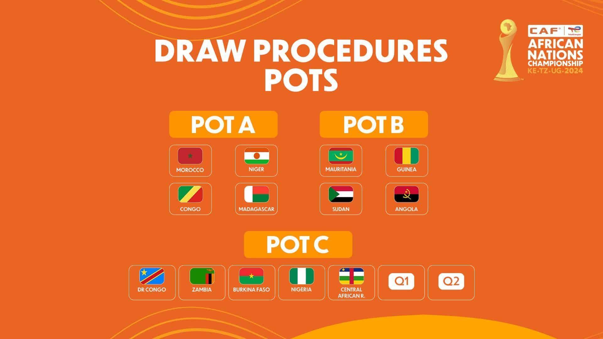 A quelques heures de la cérémonie, la CAF lève le voile sur la composition des pots et les combinaisons possibles pour les différents groupes. 03 pots ont été constitués dont 02 de 04 équipes chacun. Le pot C contient 07 équipes dont les 02 qui seront qualifiées sans avoir joué lames éliminatoires.