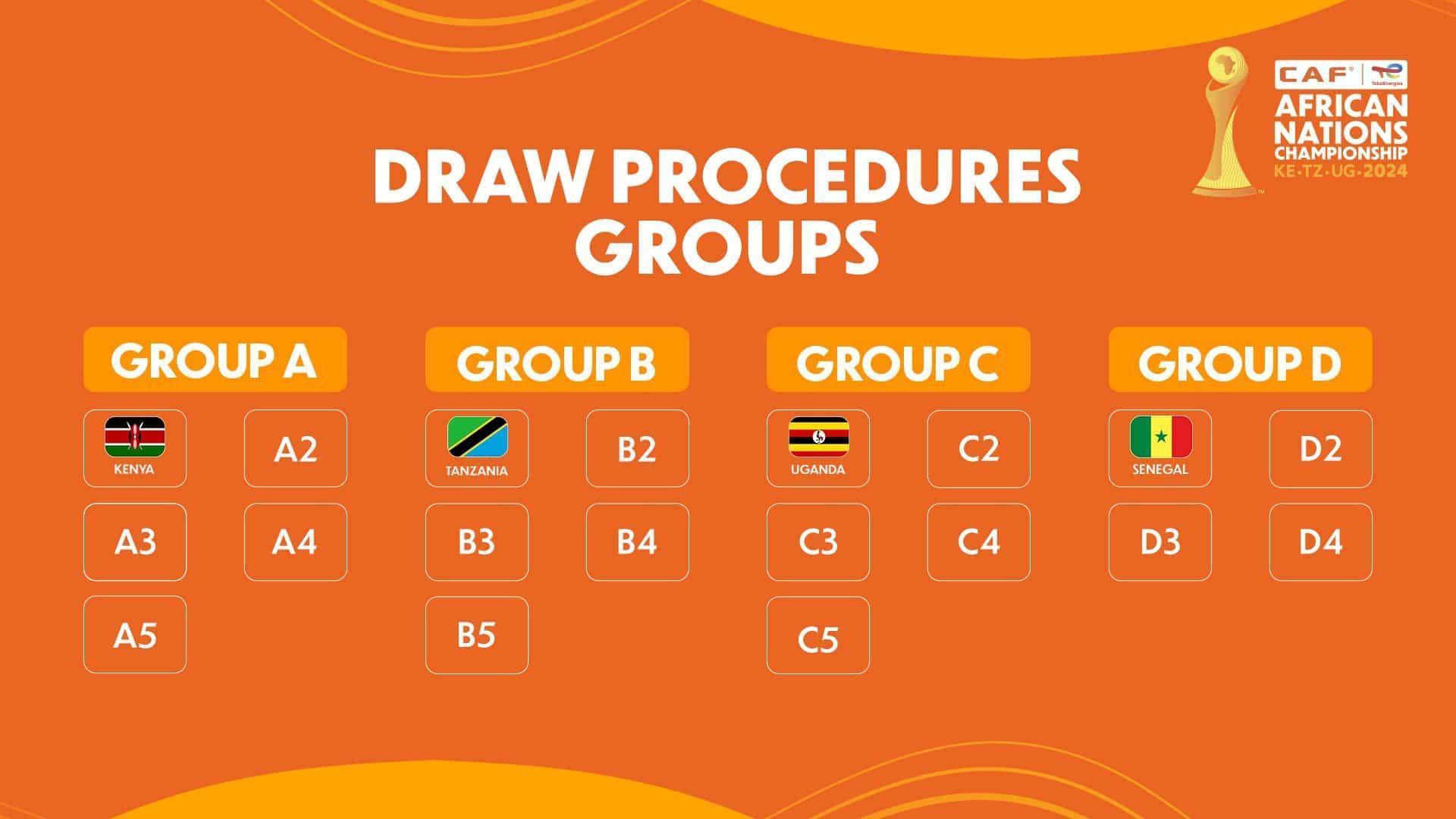04 groupes seront constitués à l’issue du tirage au sort. Les 03 pays organisateurs sont repartis dans les groupes A, B et C. Le Sénégal, champion en titre, sera dans le groupe D. Les groupes A, B et C contiendront 05 équipes alors que le groupe D sera composé de 04 équipes.