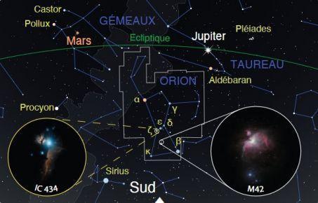 Notre conseil: facile à identifier, Orion domine majestueusement l’horizon sud vers 21 heures. On peut détecter aux jumelles M42 sous la forme d’une nébulosité grisâtre, mais la nébuleuse IC 434 n’est accessible qu’avec un télescope.