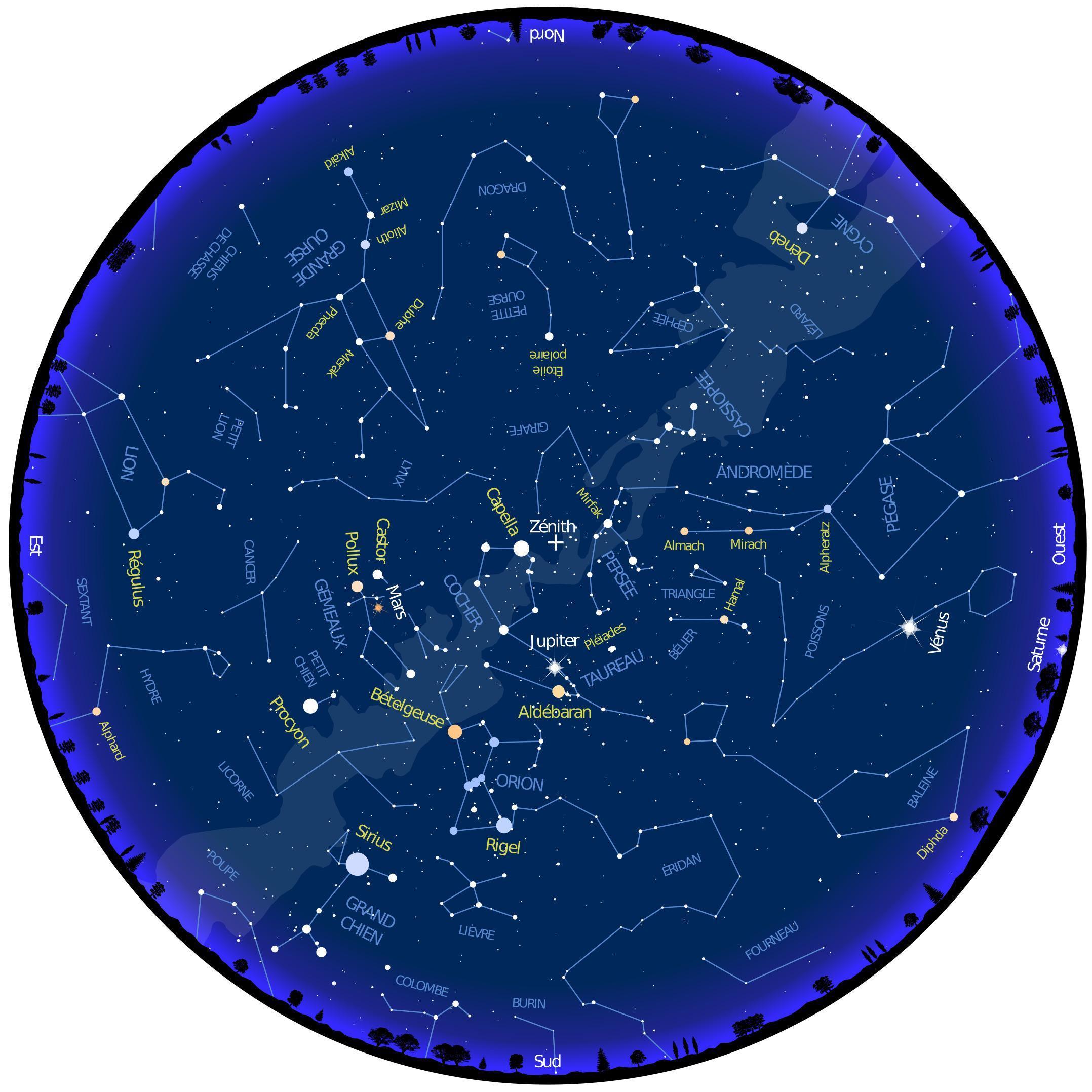 Découvrez ci-dessous la carte du ciel visible à la mi-février vers 19h (cliquez dessus pour agrandir l’image).