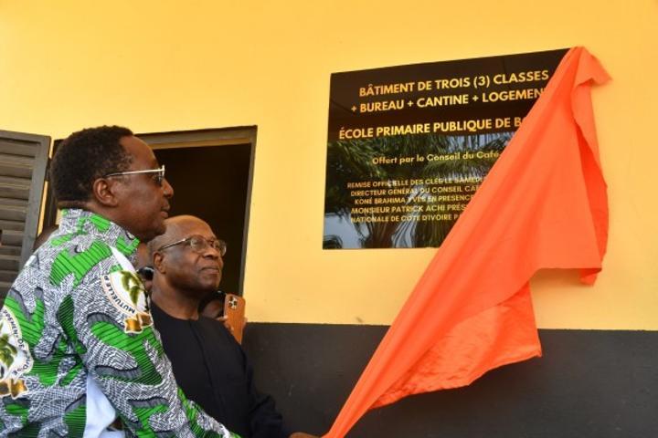 À cette occasion, le Directeur général du Conseil du Café-Cacao, Koné Brahima Yves, a procédé à la remise officielle des clés de plusieurs infrastructures modernes au sein de l’établissement. Il s’agit notamment d’un bâtiment de trois salles de classe, de deux logements pour enseignants, d’une cantine scolaire et de latrines.