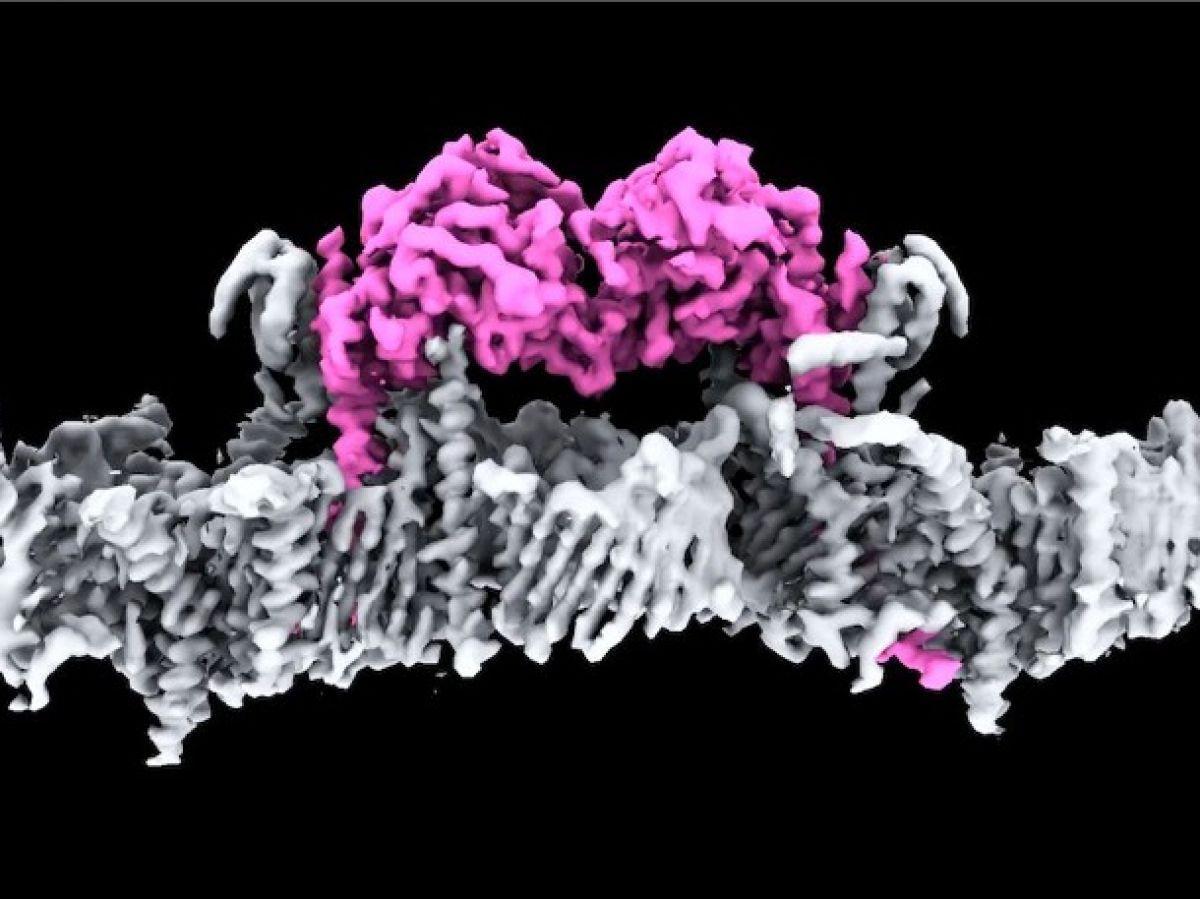 Le parcours de PINK1 est méticuleusement retracé grâce à des observations en cryo-microscopie électronique, qui permet d’obtenir des images en 3D des tissus biologiques. D’une précision de 3,1 Angstrom (soit 0,31 millionième de millimètre), elle révèle notamment la structure du dimère de PINK1 arrimée à la surface de la mitochondrie (voir l’illustration ci-dessus). « L’un des principaux obstacles à la visualisation de PINK1 est qu’il y en a peu dans la cellule et que nous avons donc eu besoin de très grandes quantités de cellules (près de 10 litres) pour obtenir suffisamment de PINK1 que nous pourrions ensuite utiliser pour la visualisation par cryo-microscopie électronique. » En outre, il est difficile d’obtenir une image en bonne résolution d’un sujet en mouvement, aussi les chercheurs ont-ils dû rendre PINK1 la plus stable possible.