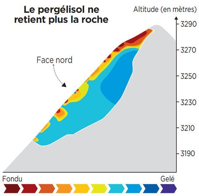 Mais l’évolution du réchauffement climatique a amené Ludovic Ravanel et ses collègues à s’intéresser à son impact sur les zones sensibles que sont les parois verticales entourant les glaciers, en contact direct avec l’atmosphère et le pergélisol superficiel couvert d’un manteau neigeux saisonnier. Car, en théorie, la glace et une température négative constante « cimentent » la roche. Que ce liant vienne à trop se réchauffer, et les équilibres sont rompus, provoquant de grands effondrements.