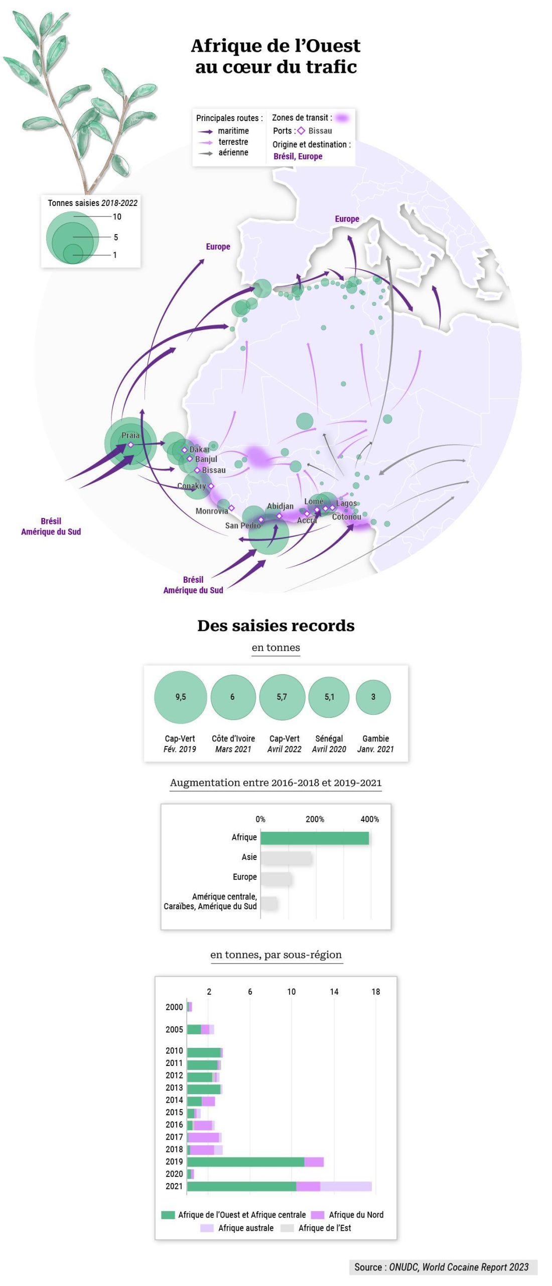 Depuis quelques années, le port d’Abidjan vit au rythme des saisies records de cocaïne. Après la « Spaghetti Connection » en 2019, c’est un autre vaste réseau transnational – mettant en cause des Espagnols, Colombiens, Ivoiriens, Libanais et Portugais – qui a été démantelé, en avril 2022. Après une accalmie, Bissau semble de nouveau être tombée dans le giron des narcotrafiquants. Début février, près d’une tonne de cocaïne y été dérobée dans les locaux de la police. Et, tandis que Dakar continue d’occuper une place centrale sur la feuille de route des cartels, de nouveaux acteurs semblent émerger, y compris au Bénin, où 3,9 tonnes de « blanche » ont été découvertes entre 2019 et 2022.