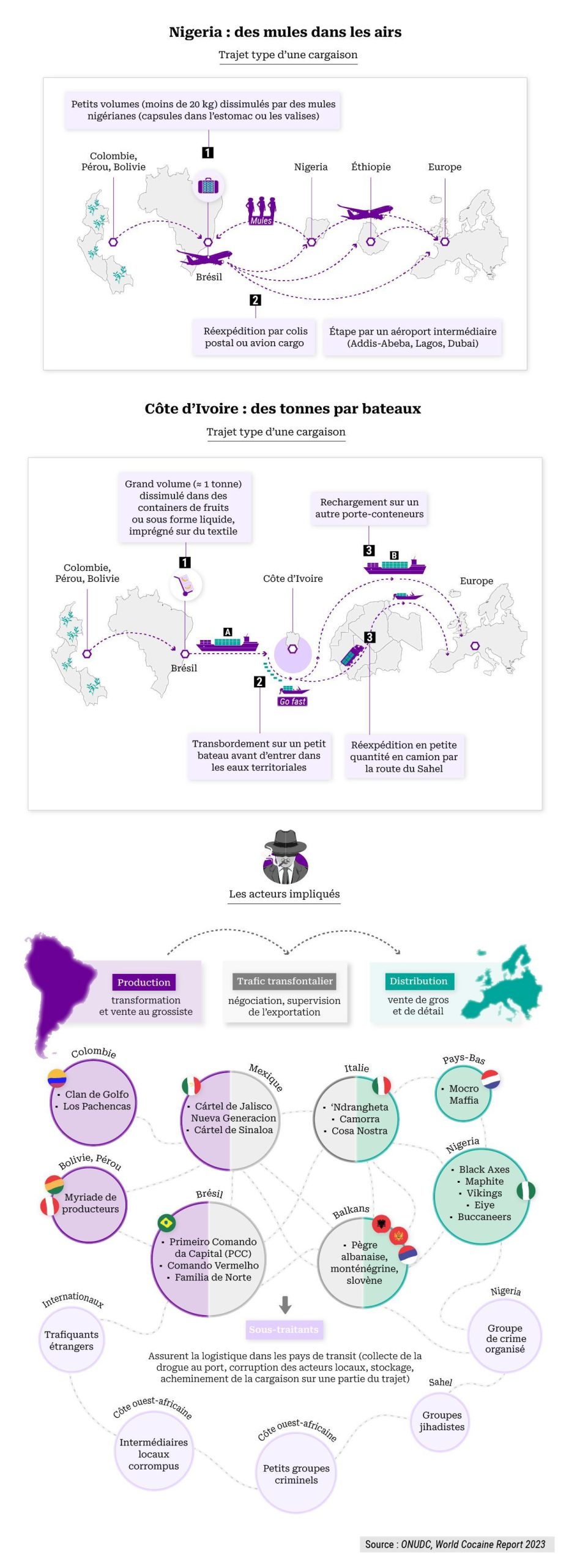Des groupes criminels nigérians ont étendu leur présence à une large partie du golfe de Guinée et supervisent désormais une partie du transit vers la Méditerranée en passant par le désert du Sahara. Certains « barons igbos » peuvent même se targuer de gérer « en toute autonomie des importations de cocaïne grâce à leur bonnes relations avec les narcotrafiquants de São Paulo » rapportent Célia Lebur et Joan Tilouine dans leur livre-enquête Mafia Africa (Flammarion, mars 2023).