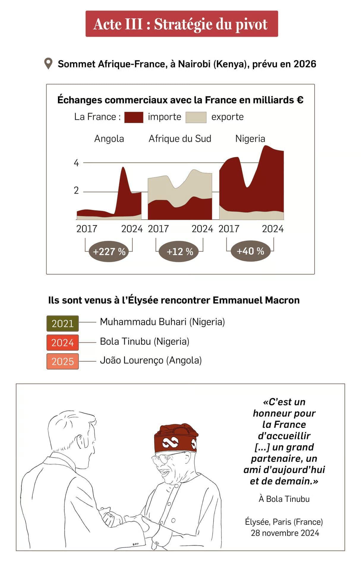 La France importe 12 % de son pétrole d’Afrique, principalement de l’Angola et du Nigeria, pays devenu en 2024 le premier partenaire économique de la France en Afrique subsaharienne. Les échanges commerciaux avec l’Angola ont bondi de 227 % depuis 2017. Le 28 novembre 2024, lors de la visite du président nigérian Bola Tinubu à Paris, le chef d’État français est on ne peut plus explicite: « Les marchés et la population de demain sont au Nigeria, pas au Sahel. Ce n’est pas une démarche naturelle pour les chefs d’entreprise français de frapper à la porte du Nigeria, mais à l’avenir, ce sera très clairement la chose à faire. »