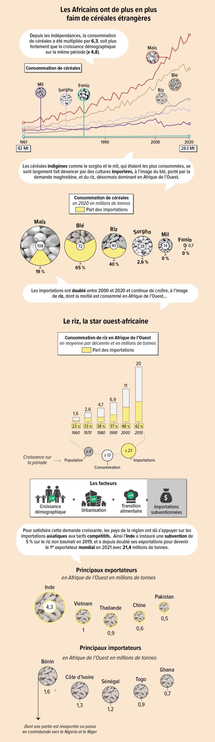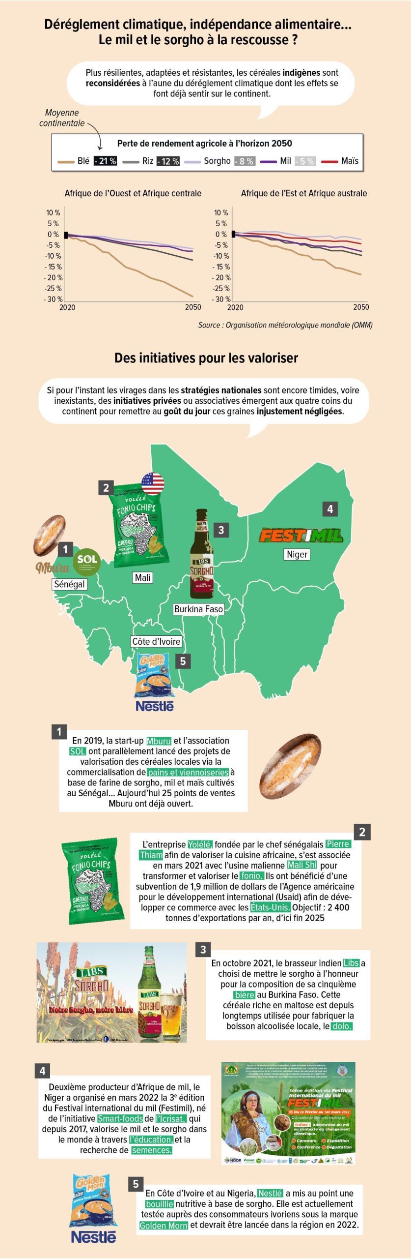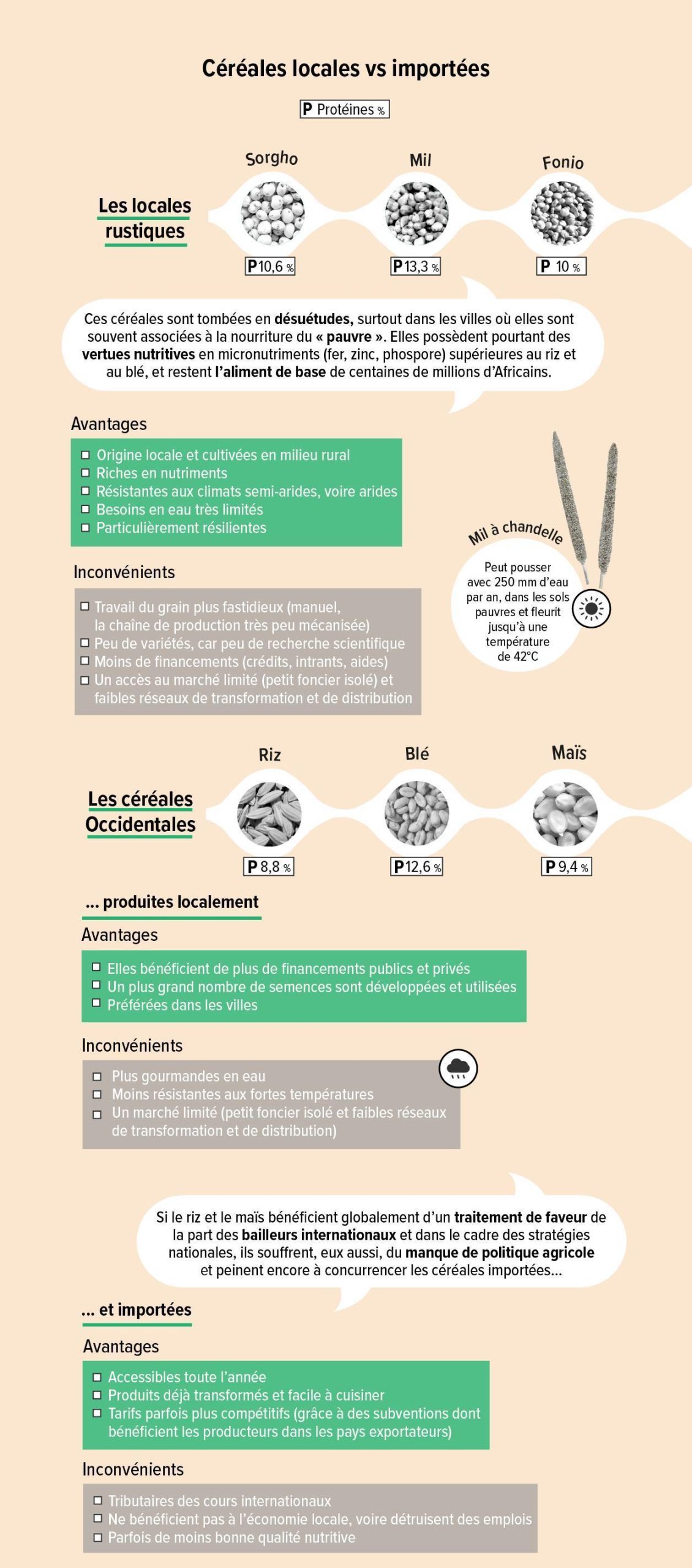 Une autre piste, déjà largement explorée par plusieurs pays et qui a l’avantage de moins dépendre de la (mauvaise) volonté des bailleurs de fonds, est le retour aux céréales locales. Mieux adaptées au climat que les céréales « occidentales », dotées de bien meilleures qualités nutritives, mil, sorgho, fonio ou teff ont pâti des politiques agressives mises en place lors de la période coloniale, puis de la concurrence déloyale du blé ou du maïs largement subventionnés par les pays exportateurs. Une piste que prône notamment Makhtar Diop, directeur de la Société financière internationale (IFC), qui plaidait en juin dans un entretien à Jeune Afrique en faveur d’une plus grande mobilisation du secteur privé et insistait sur l’urgence à « booster la production du fonio, du mil et la production locale du riz ». Décryptage, en infographies, des raisons qui plaident pour un recours massif à ces céréales locales.