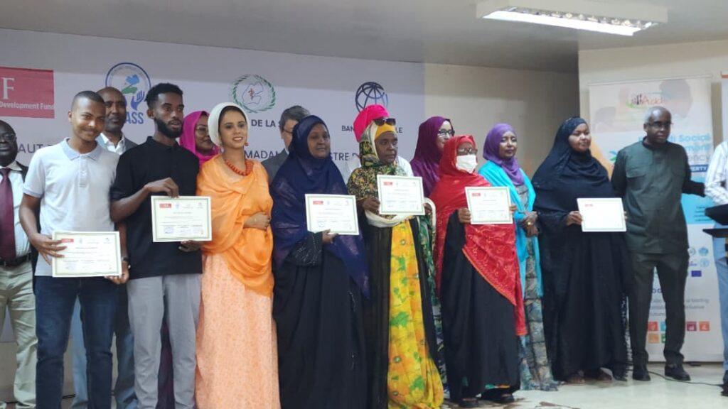 Africa-Press – Djibouti. Sous le haut patronage de la Ministre des Affaires sociales et des Solidarités, Mme Ouloufa Ismaël Abdo, l’ADDS a organisé le lundi matin dernier dans la salle de spectacle du siège de l’UNFD, une cérémonie de remise de certificats à 135 mères conseillères et agents communautaires, formés dans le cadre du projet « Mobilisation des Communautés pour une Meilleure Nutrition » financé par un don japonais et administré par la Banque mondiale.
