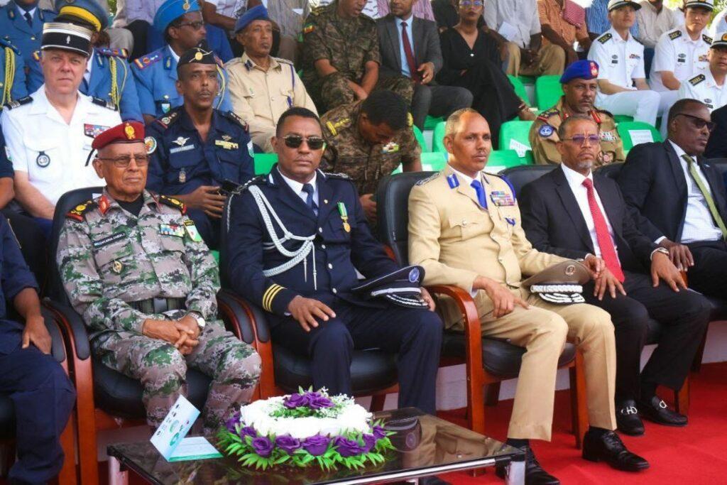 Des membres du gouvernement, des parlementaires, des représentants des corps diplomatiques, des hauts gradés militaires des forces étrangères basées au pays et de nombreuses personnalités civiles ont assisté à l’évènement. Le Commissaire Général de la Police Fédérale éthiopienne Demelash Gebre michael et le Chef de la Police Somalienne, le Brigadier Général Sulub Ahmed Firin, et leurs collaborateurs respectifs étaient les invités d’honneur de cette cérémonie.