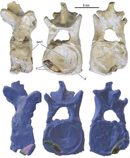 Le fossile provient de la Mooreville Chalk d’Alabama, un dépôt daté du Santonien-Campanien (85 à 72 millions d’années) et correspond à un individu subadulte Polycotylus latipinnis d’environ quatre mètres de long. La surprise se trouvait dans une de ses vertèbres cervicales médianes: une grosse dent brisée à la base et à la pointe, enfoncée dans l’os. Le spécimen a été repéré par Christopher Brochu alors qu’il examinait d’autres fossiles conservés au musée. Comme la dent était trop endommagée pour être identifiée à l’œil nu, l’équipe a utilisé un scanner pour la visualiser sans l’extraire.