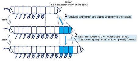 Ces travaux démontrent que, quelques jours avant le début de la mue, lors de la période préparatoire, apparaissaient deux paires de minuscules pattes cachées sous la cuticule (structure qui enveloppe le corps des arthropodes) des derniers segments. Juste avant la mue, durant la phase de rigidité, ces amorces de pattes ont grandi et apparaissaient bien plus clairement hors du segment qui les portait (voir illustration ci-dessous). Elles étaient alors couvertes d’une fine membrane, formant des saillies transparentes. En même temps, un nouveau segment faisait son apparition. Après la mue, ces pattes sont devenues libres et pleinement fonctionnelles.