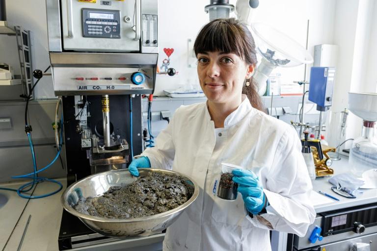La chercheuse française Anna Vanderbruggen tient une bassine de liquide sombre et bouillonnant, résultat d’un processus mis au point pour récupérer le graphite des vieilles batteries lithium-ion dans un laboratoire de l’Institut Helmholtz de Freiberg, dans l’est de l’Allemagne, le 27 février 2023 (AFP – JENS SCHLUETER)