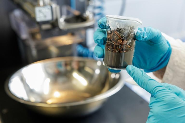 La scientifique française Anna Vanderbruggen montre le résultat du broyage d’un accumulateur lithium-ion contenant des feuilles d’aluminium, des feuilles de cuivre et des particules dans la partie haute du pot, et la « masse noire » avec le graphite, le cobalt, le nickel et le manganèse en bas, dans un laboratoire de l’Institut Helmholtz de Freiberg dans l’est de l’Allemagne, le 27 février 2023 (AFP – JENS SCHLUETER)
