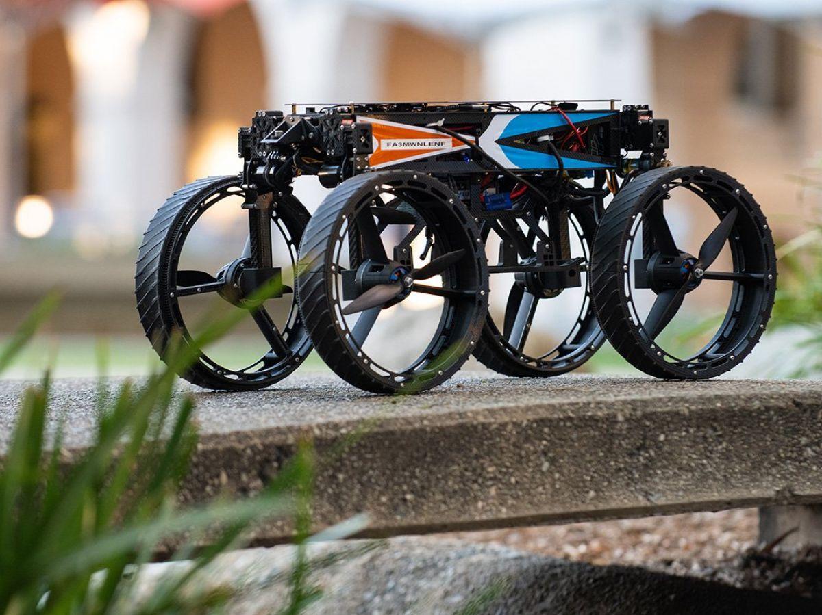 Concrètement, l’engin se présente comme un drone quadricoptère en fibre de carbone pesant 5,6 kg au concept très familier. Mais les quatre rotors de 25 cm de diamètre peuvent pivoter et se rabattre à la verticale, donnant alors au robot l’apparence et les facultés d’un petit véhicule à quatre roues.