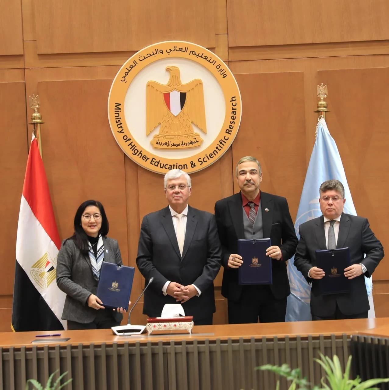 وقع الاتفاق، الدكتور حسام عثمان، نائب وزير التعليم العالي والبحث العلمي لشؤون الابتكار والذكاء الاصطناعي والبحث العلمي، السفير خالد أنيس، مساعد وزير الخارجية ومدير إدارة التعاون الدولي للتنمية، وتشيتوسي نوجوتشي – الممثل المقيم لبرنامج الأمم المتحدة الإنمائي.