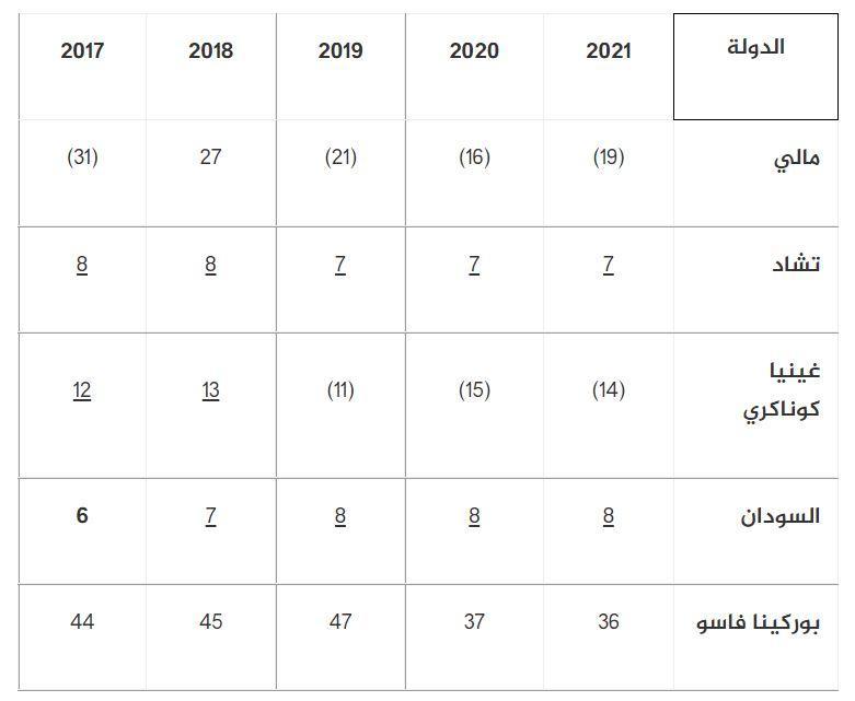 ومراجعة هذا التصنيف خلال السنوات الخمس الماضية تكشف أن الدول الإفريقية التي شهدت انقلابات مؤخرًا تندرج جميعها تحت خطر الهشاشة بتدرجاته المختلفة. وبينما تستقر كل من السودان وتشاد ضمن الدول الأكثر عرضة للهشاشة، يُلاحَظ ميل المؤشر في البقية نحو التراجع التدريجي في المجمل وإن شهدت تقدمًا ضئيلًا في بعض السنوات.