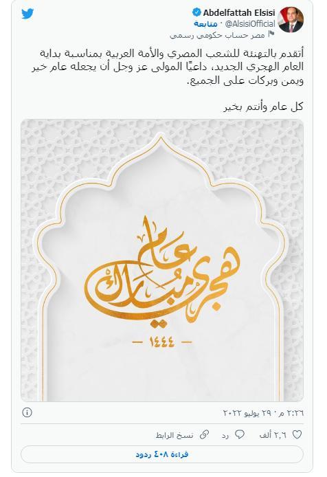 وقال السيسي في تدوينه له على موقع “تويتر”: “أتقدم بالتهنئة للشعب المصري والأمة العربية بمناسبة بداية العام الهجري الجديد، داعيًا المولى عز وجل أن يجعله عام خير ويمن وبركات على الجميع”.
