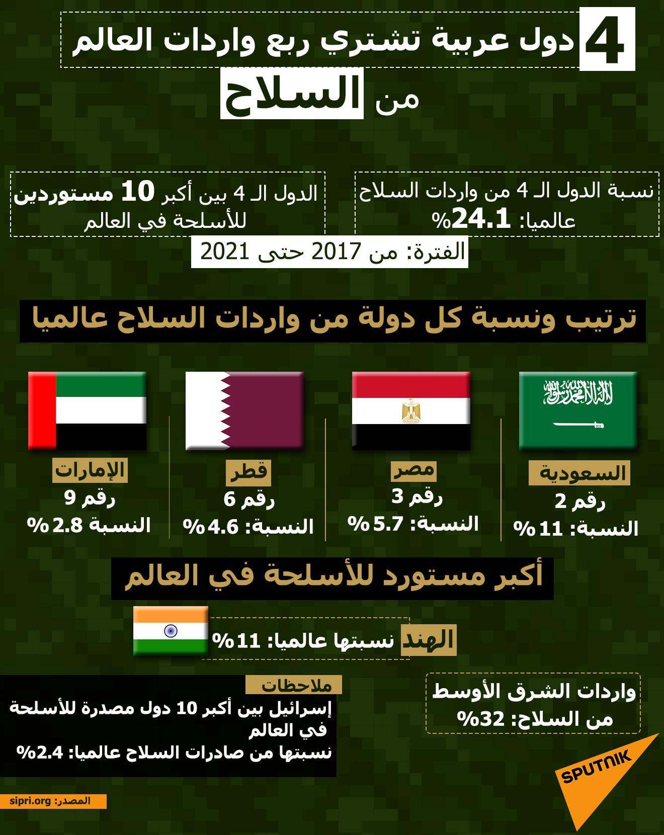 أفريقيا برس – مصر. احتلت منطقة الشرق الأوسط المرتبة الثانية عالميا بين أكبر مناطق العالم المستوردة للأسلحة بنسبة وصلت إلى 32 في المئة من ورادات السلاح العالمية. جاءت 4 دول عربية بين أكبر 10 دول مستوردة للأسلحة في العالم خلال الفترة من 2017 حتى 2021، وهي السعودية ومصر وقطر والإمارات، حسبما ذكر تقرير معهد ستوكهولم لأبحاث السلام لعام 2022.