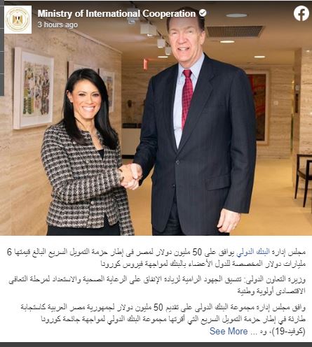وقالت وزارة التعاون الدولي المصرية، في بيان لها اليوم الأحد، على صفحتها في موقع التواصل الاجتماعي “فيسبوك، “إن 50 مليون دولار، هو الحد الأقصى المتاح في إطار حزمة التمويل السريع قياسا على التعداد السكاني التي حددتها مجموعة البنك الدولي”.
