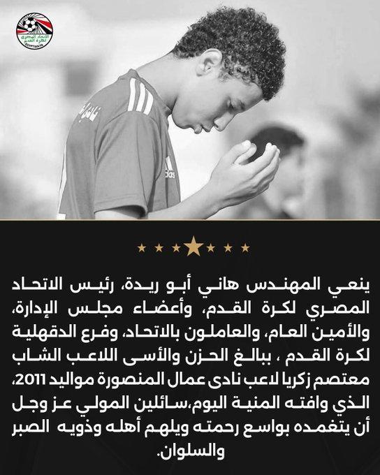 أفريقيا برس – مصر. نعى الاتحاد المصري لكرة القدم لاعب نادي عمال المنصورة معتصم زكريا الذي توفي أمس السبت، إثر تعرضه لحادث سير أليم أثناء توزيعه وجبات إفطار على الصائمين على طريق بمحافظة الدقهلية.