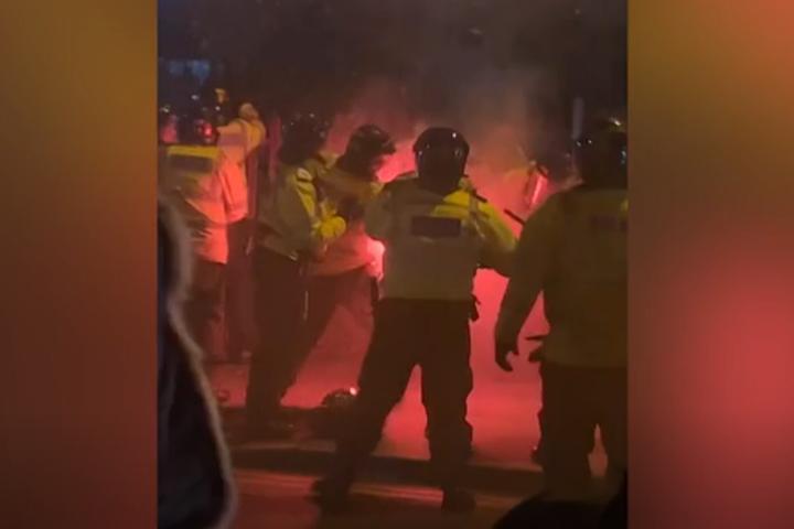 Two police horses were punched and kicked, and several police dogs were also injured walking on broken glass after bottles were thrown at officers. They are not thought to be seriously hurt.